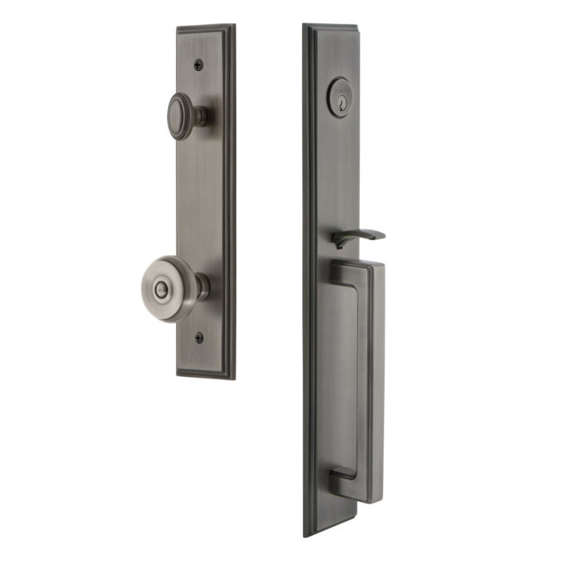 Waterfall edges and stylish design provide a classic, but dignified update to your exterior door hardware. The Fifth Avenue One-Piece Handleset is available with any Grandeur Hardware knob and lever